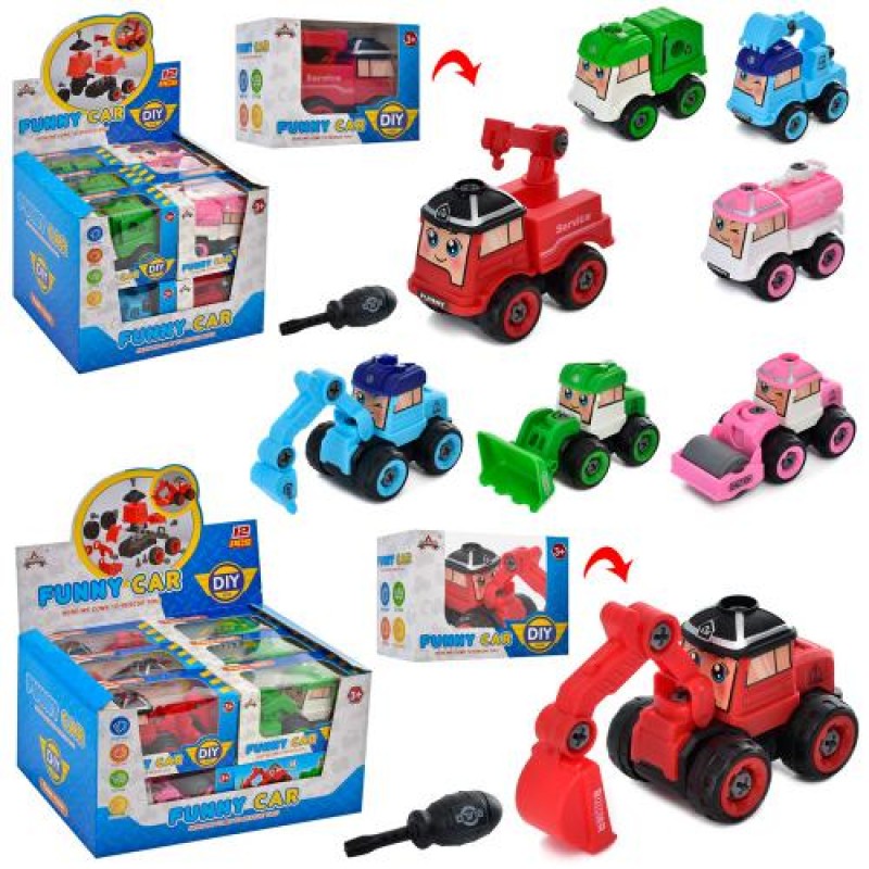 RP, на шурупах, стройтехника, отвертка, 2вида(машинка10,5см в кор-ке 11,5-6-9,5см/14см в кор-ке14-8-6,5см) 12шт(4вида) в дисплее