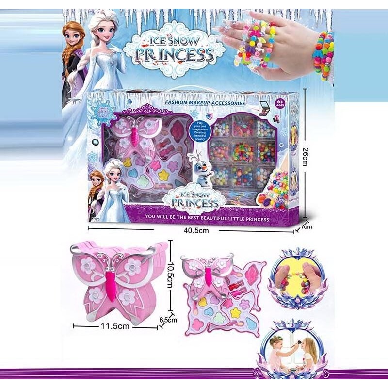 Роскошный набор для макияжа и создания украшений из ярких бусинок для маленьких принцесс. Большой 3-уровневый набор косметики включает в себя 5 ярких цветов теней для век и дополнительно аппликаторы к каждому цвету, 2 яркие помады красного и розового оттенков и невероятный блестящий блеск в трендовом розовом цвете. С ним ты сможешь нанести тени и румянец себе и стать настоящей леди или накрасить подругу и вообразить себя топовым визажистом. И все это сложено в один небольшой ящик, который легко можно взять с собой куда угодно. А большой выбор ярких бусин станет прекрасным дополнением к образу юной леди. В комплект ходит 9 видов бусин и эластичные резиновые шнурки для создания браслетов или бусы. Особенности: - 3-уровневый набор косметики, содержащий тени для век и аппликаторы для нанесения, 2 помады разных цветов, блеск для губ; - 9 ячеек с бусинами разных цветов и форм; - эластичные резиновые шнурки для плетения украшений; – набор выполнен в стиле известного мультфильма.