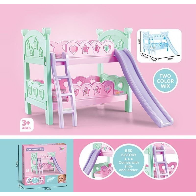 Кровать для кукол станет отличным дополнением к коллекции игрушечной мебели. Двухъярусная конструкция с приставной лестницей и горкой, а также комплектом одеяла с подушками. Кровать легко собирается и имеет небольшой вес. Благодаря компактным размерам кровать можно легко перемещать и поместить в любое место.