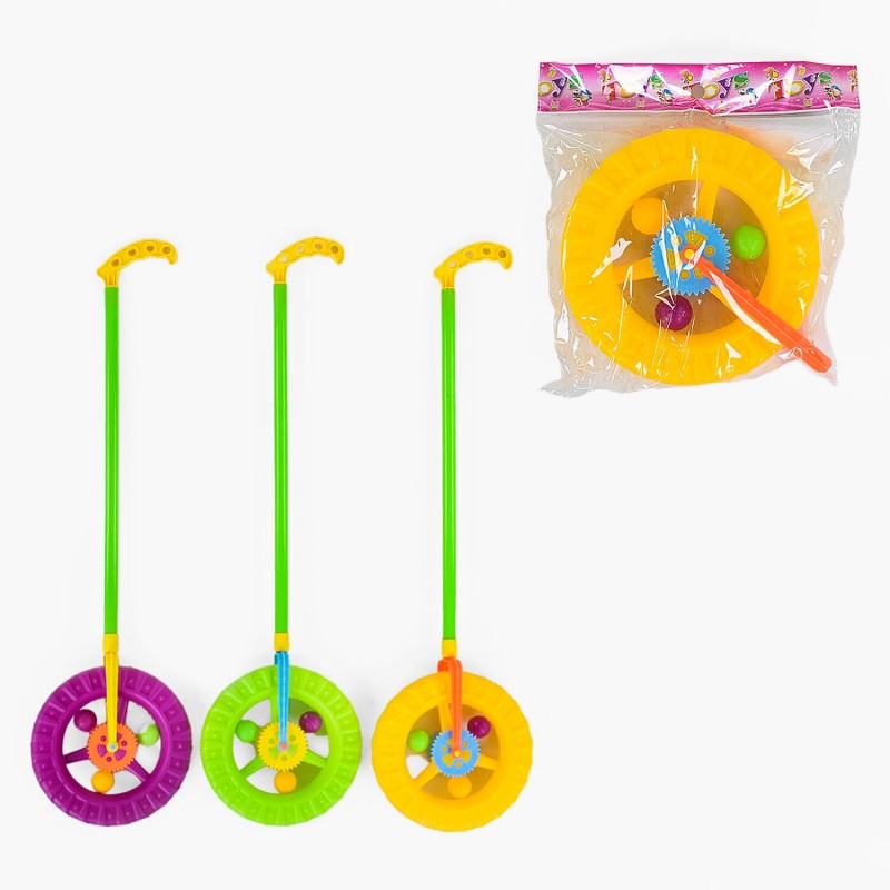 Каталка 059 Е представляет собой колесо зелёного, оранжевого и фиолетового цвета на длинной ручке.