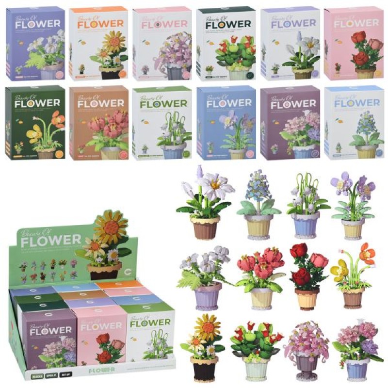 цветы в горшке, от 105дет, в кор-ке, 12шт(12 видов) в дисплее, 28,5-13-19,5см