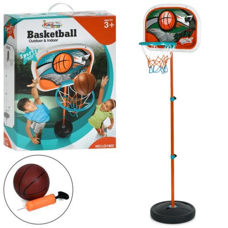 на стойке(металл) 123см/160см, щит(пластик) 46-33см, кольцо (пластик) 26см, сетка, мяч, насос, в кор-ке